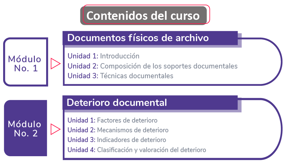Este curso se presenta como una herramienta de apoyo para la comprensión y análisis del deterioro documental, para que posteriormente los participantes puedan realizar un diagnóstico acertado del estado de conservación de los archivos físicos, conociendo las amenazas y riesgos a los que están expuestos, y poder así, plantear acciones que permitan evitar o mitigar los riesgos de deterioro documental.