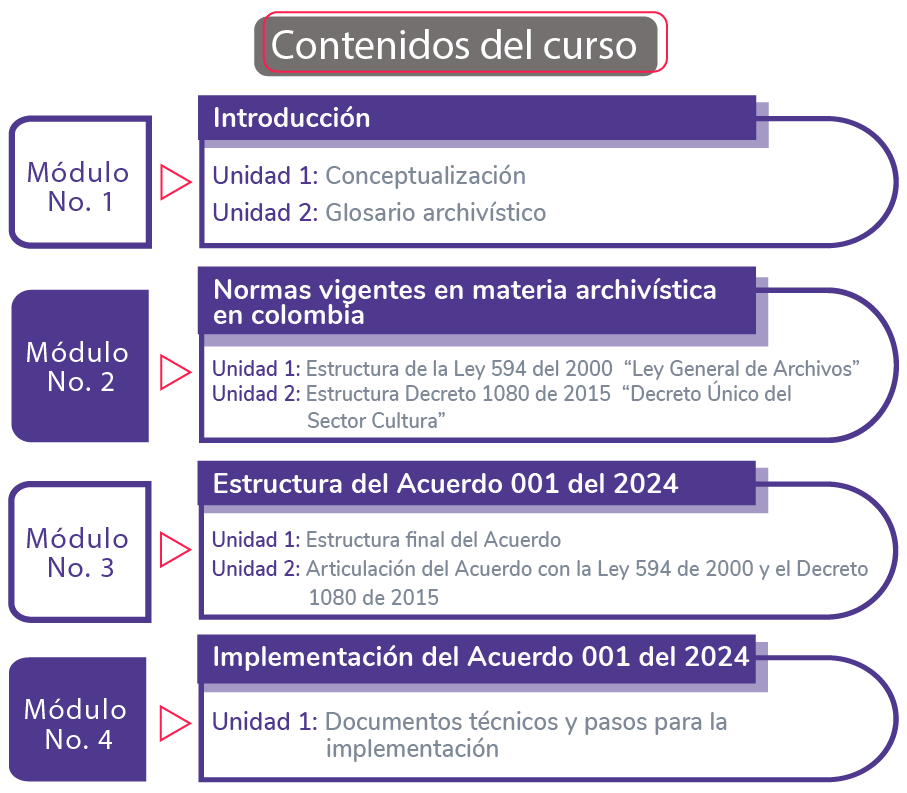 Durante el desarrollo del curso damos a conocer de manera detallada el Acuerdo 001 de 2024 “Por el cual se establecen los criterios técnicos y jurídicos para implementar la función archivística en el estado colombiano y se fijan otras disposiciones", con el objetivo de brindar las herramientas conceptuales y metodológicas que permiten establecer los criterios técnicos y jurídicos para facilitar la implementación de la Ley General de Archivos y sus normas reglamentarias, para hacer más eficiente y eficaz la Función Archivística y la Gestión Documental.